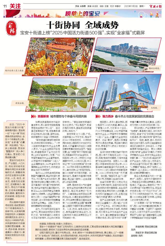而从榜单内里探寻会发现,组成宝安的10个街道各有实力、各有千秋,从滨海风情到临空经济,从智能制造到潮流生活,这片土地正以十种独特气质,共同谱写新时代街道发展的宝安篇章。其中,西乡街道、新安街道携手入围前10,展现城区勃勃生机与发展活力。